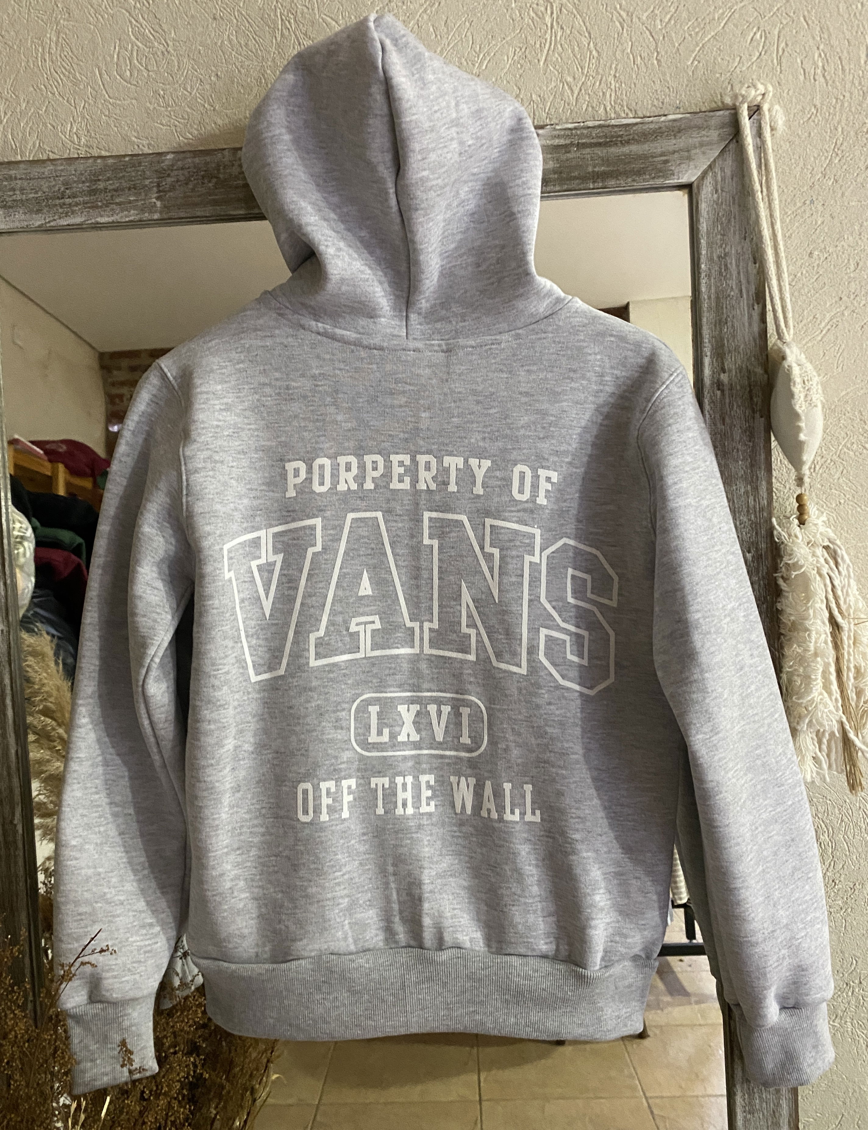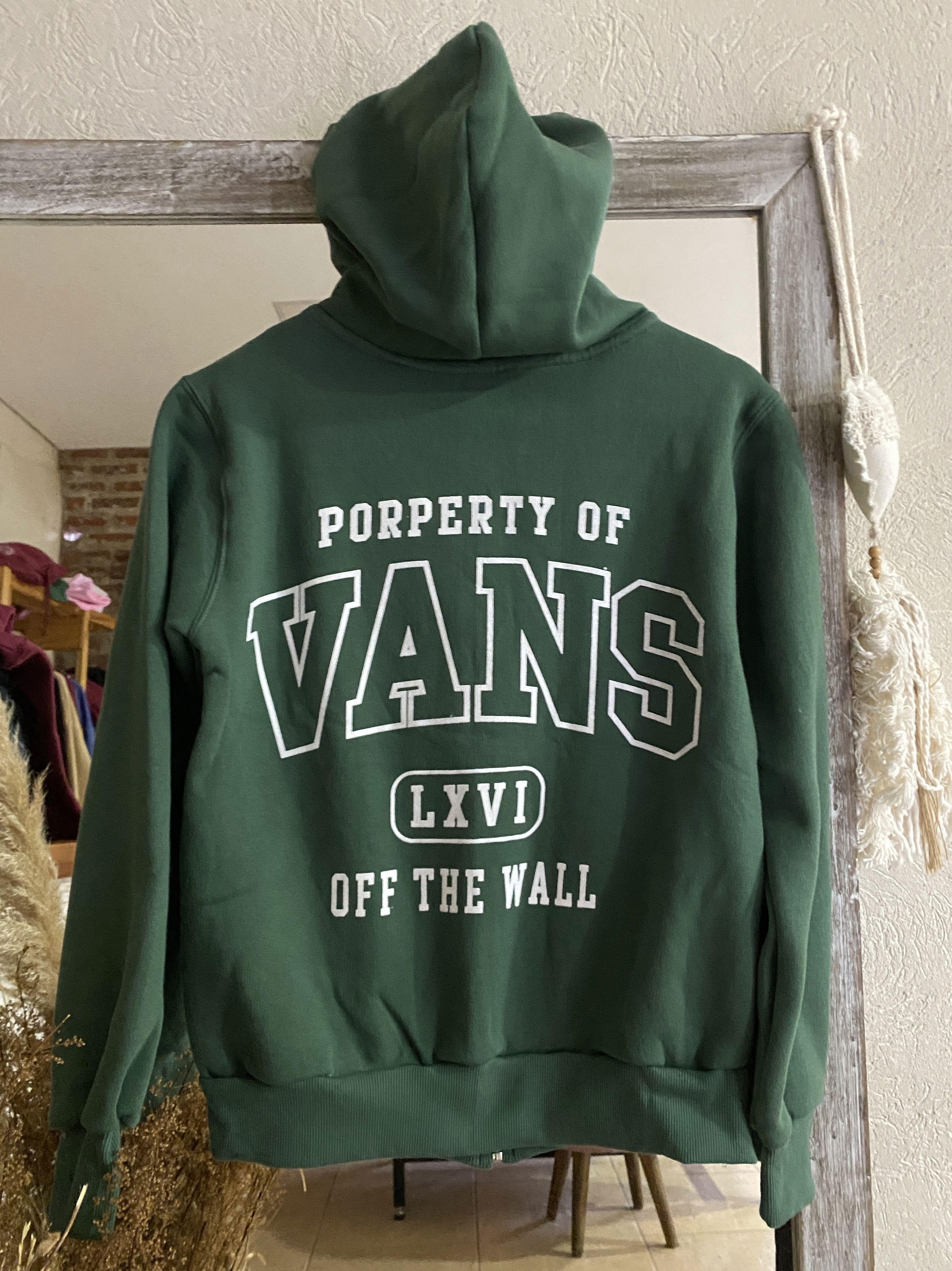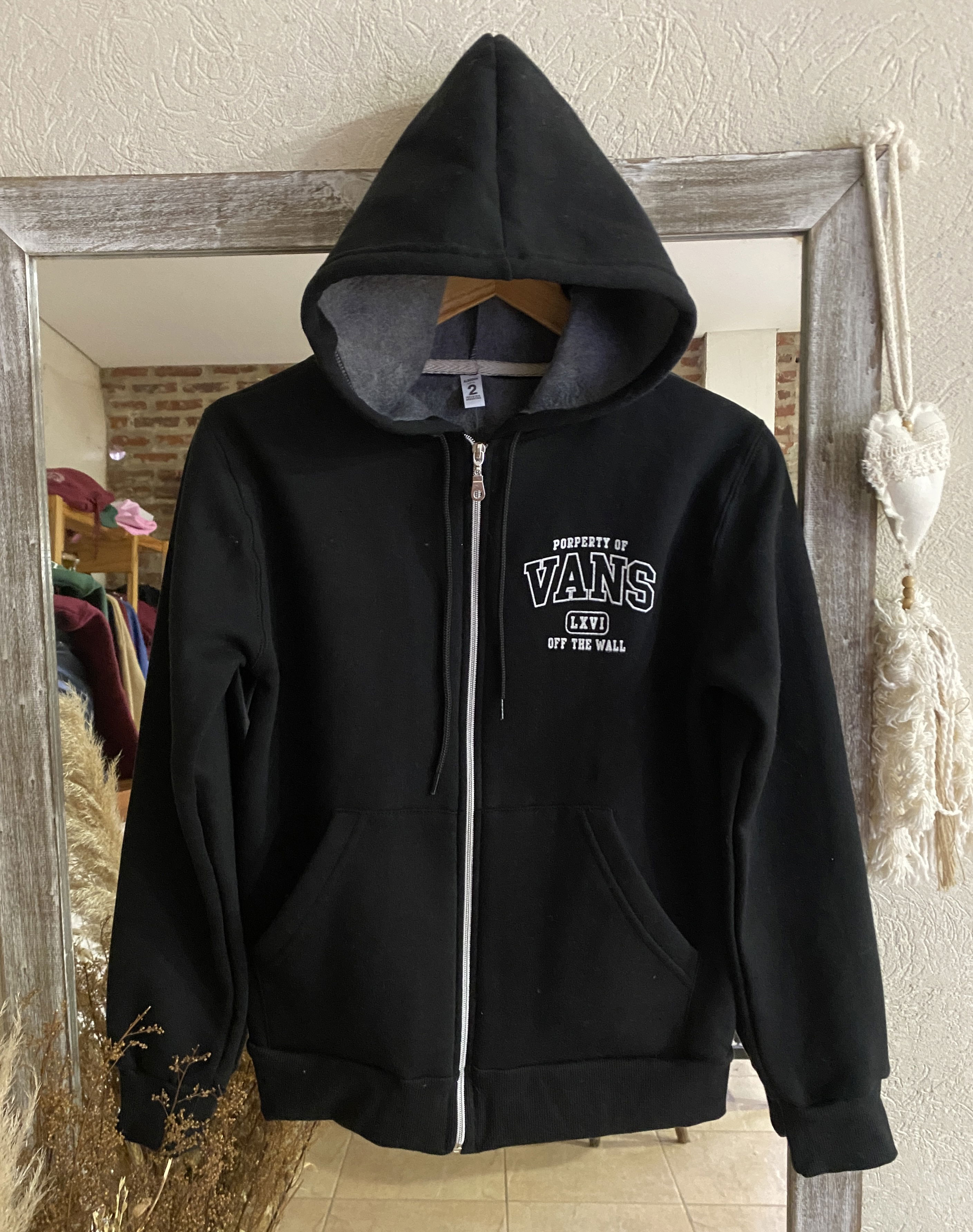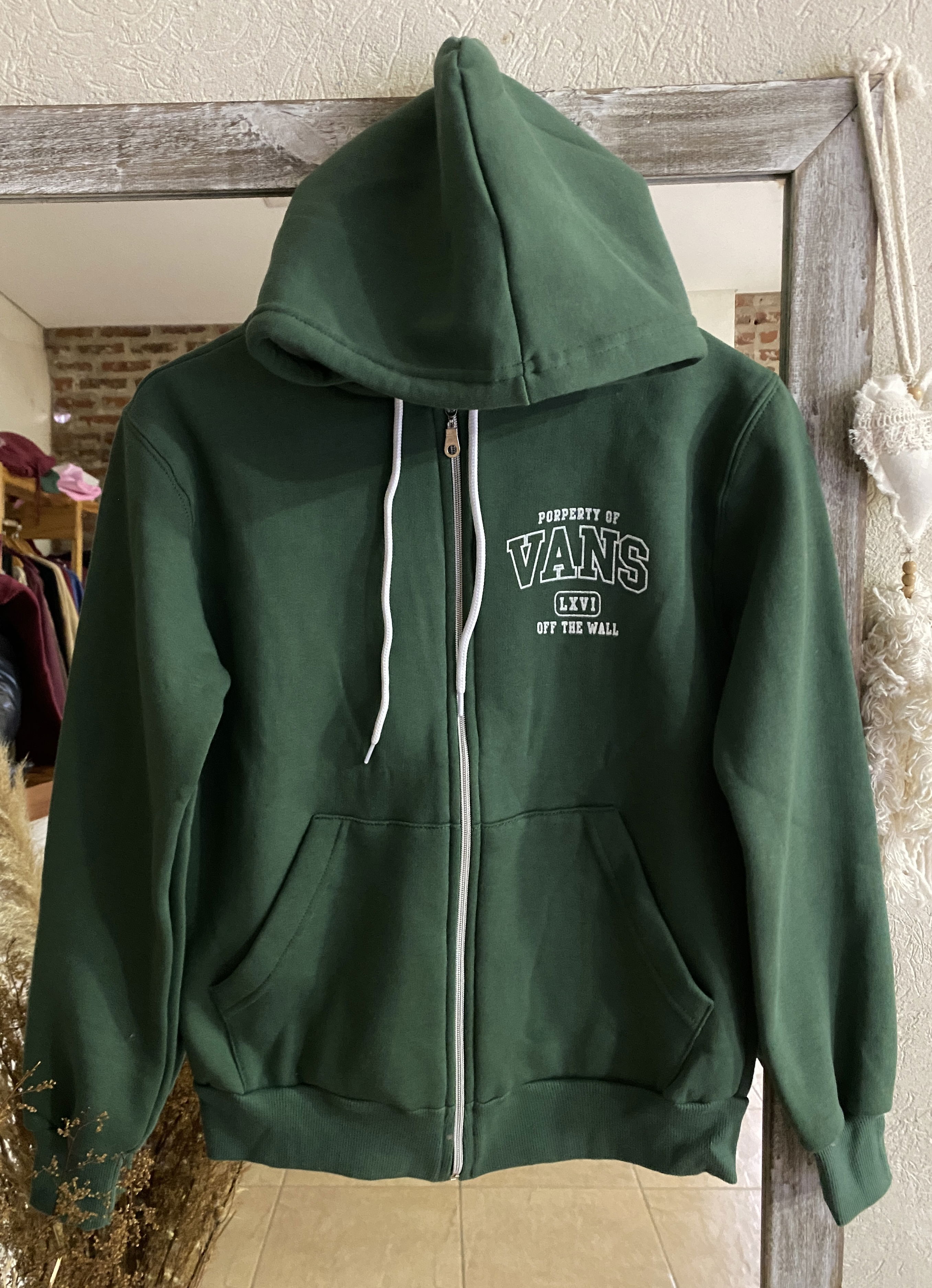 Campera de algod贸n peinado friza premium doble estampa vans, bolsillos canguro, capucha, terminaciones perfectas, pu帽o y cintura el谩stica, cierre met谩lico, cuello reforzado.