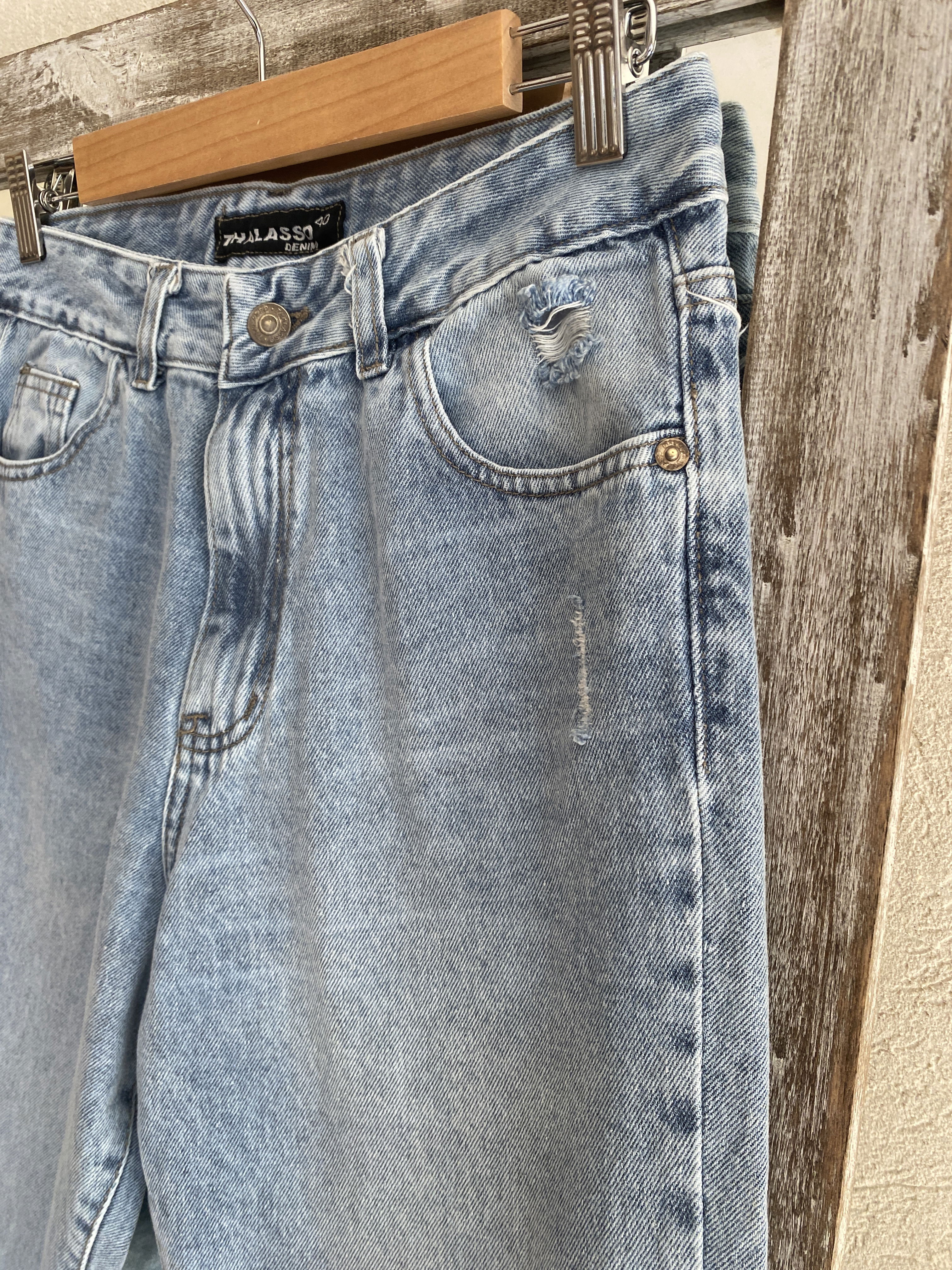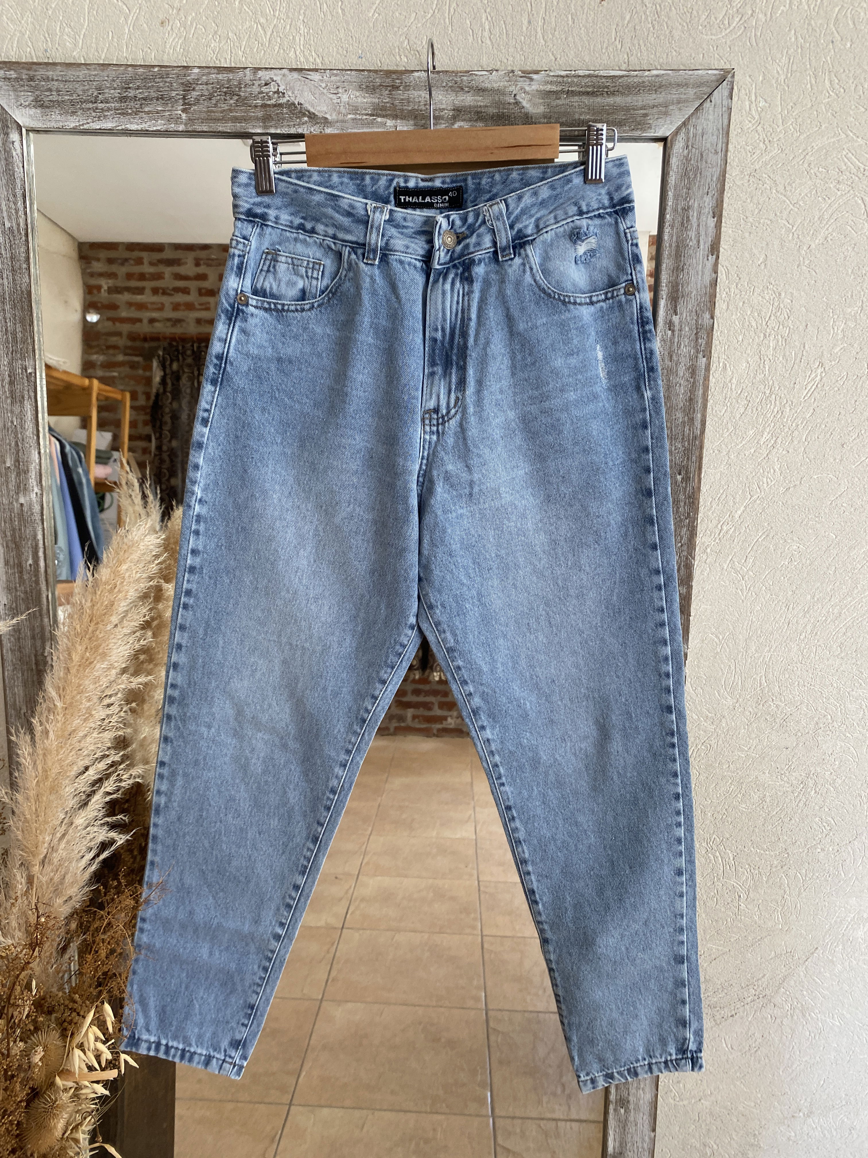 Jean Mom rijido con pequeñas roturas, bolsillos delanteros y traseros, calce Perfecto y Excelente calidad. Marca thalasso