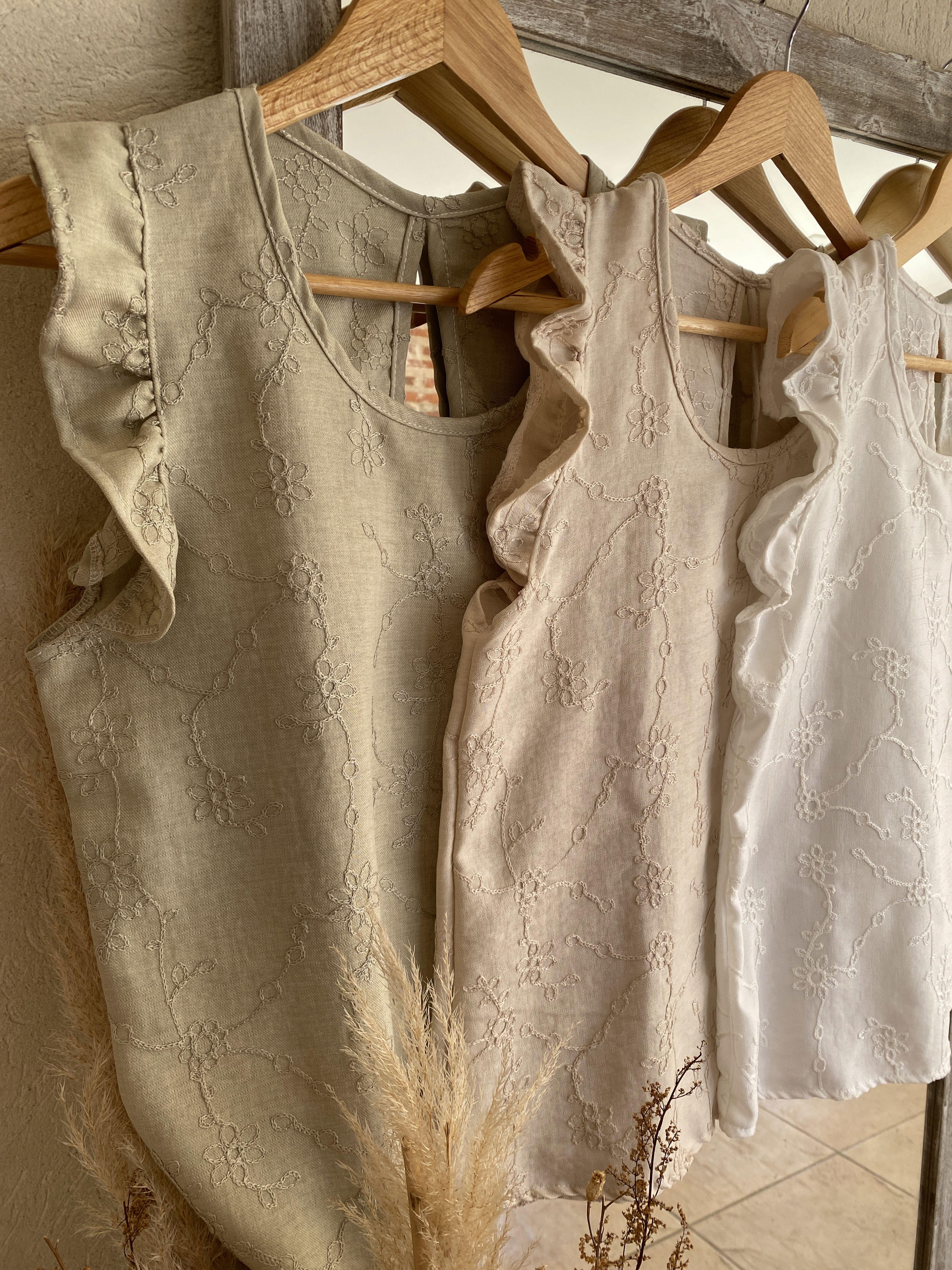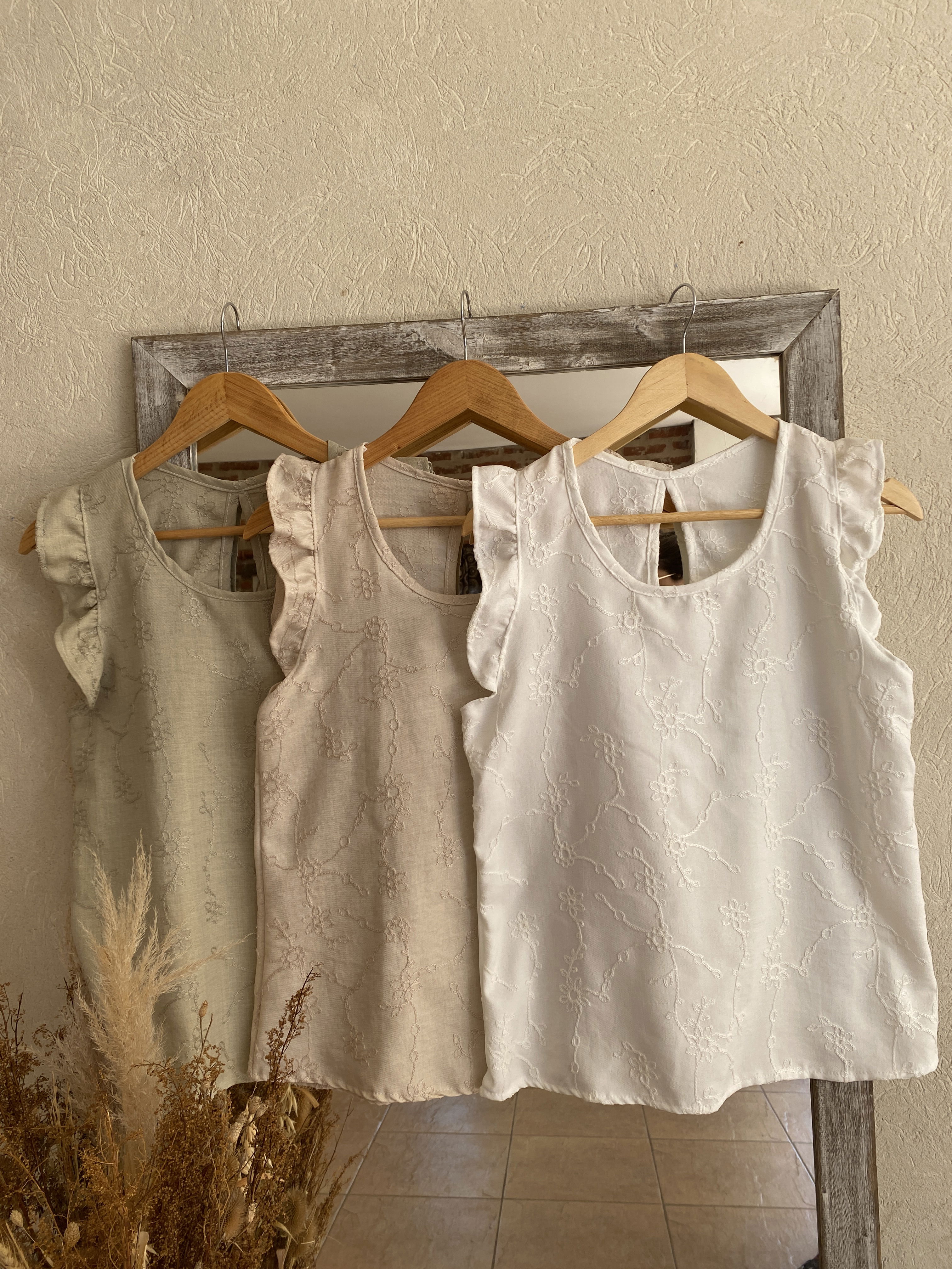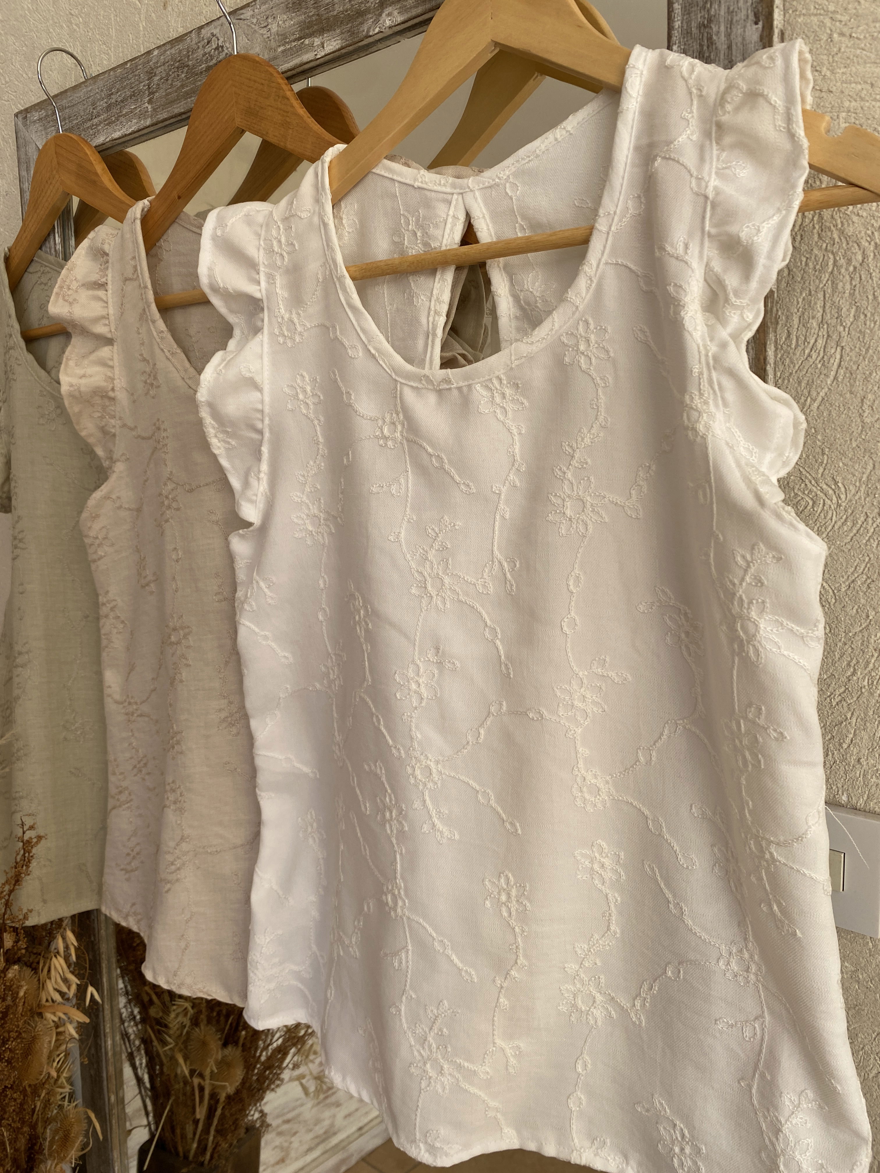 Blusa de Lino bordada, tela súper premium y lo mejor no se arruga. Posee una gota en la espalda y volados en hombros. Talle único sueltita. Abarca S/M