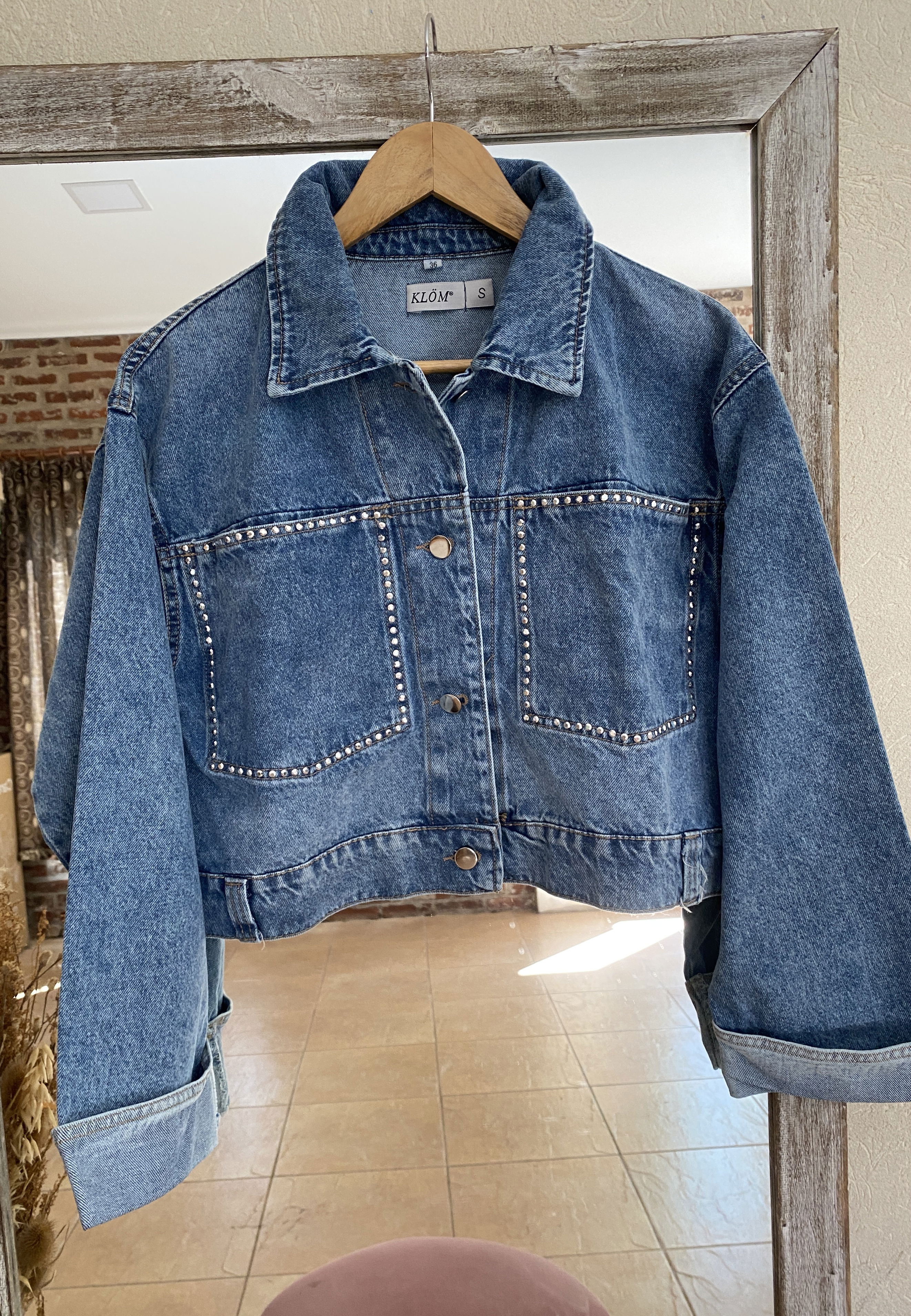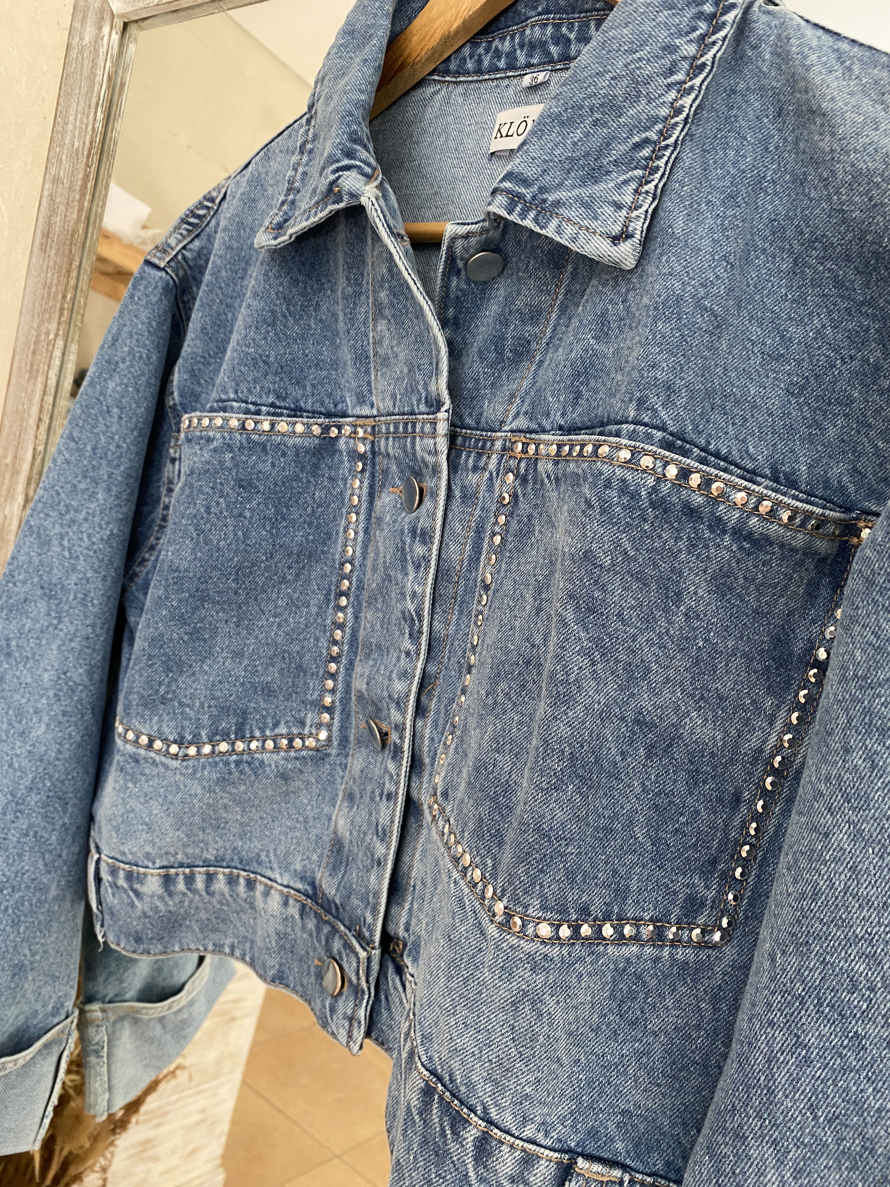 Campera de jean a la cintura con strass en los bolsillos estilo semi over. Queda muy linda y súper combinable