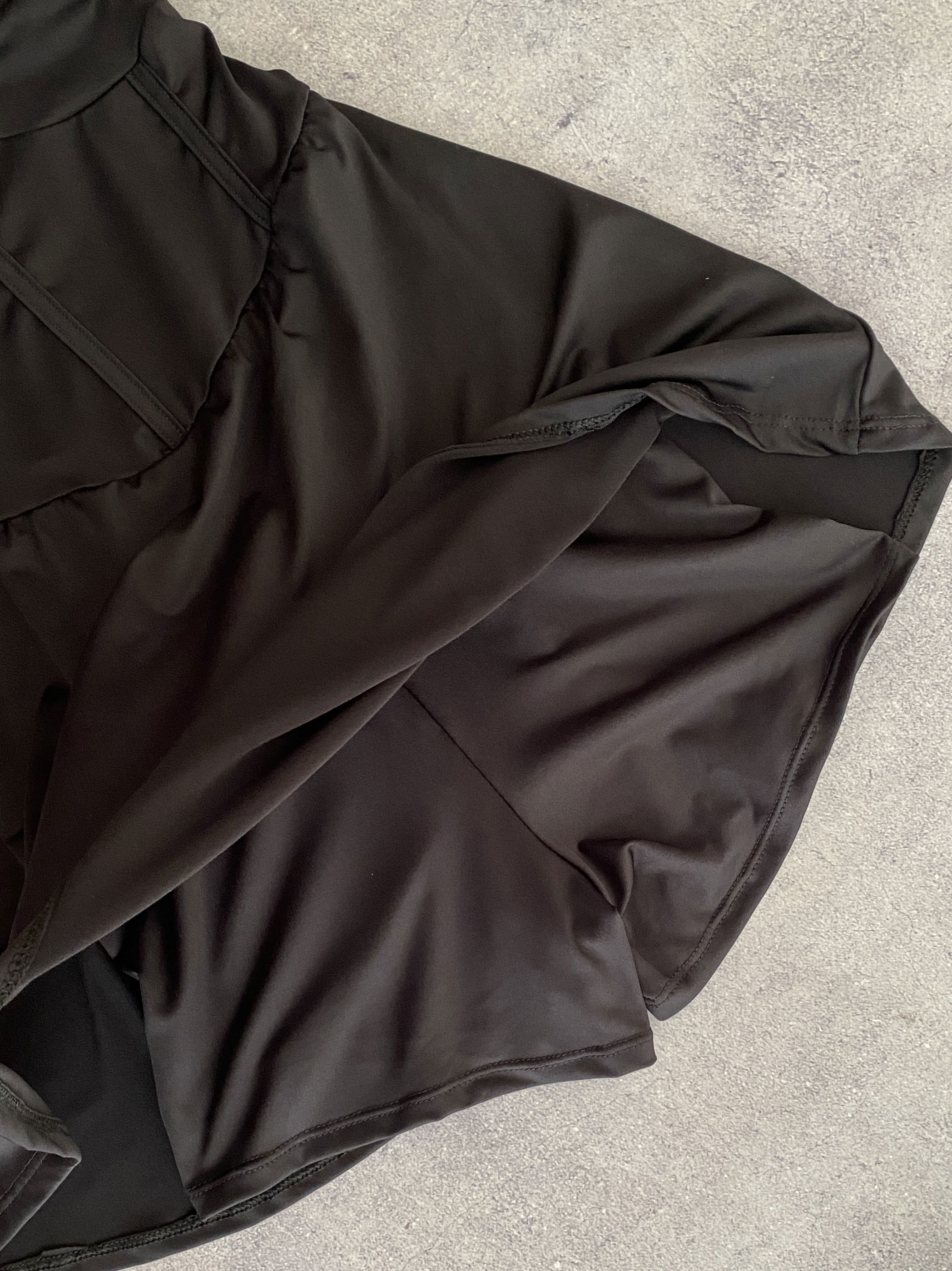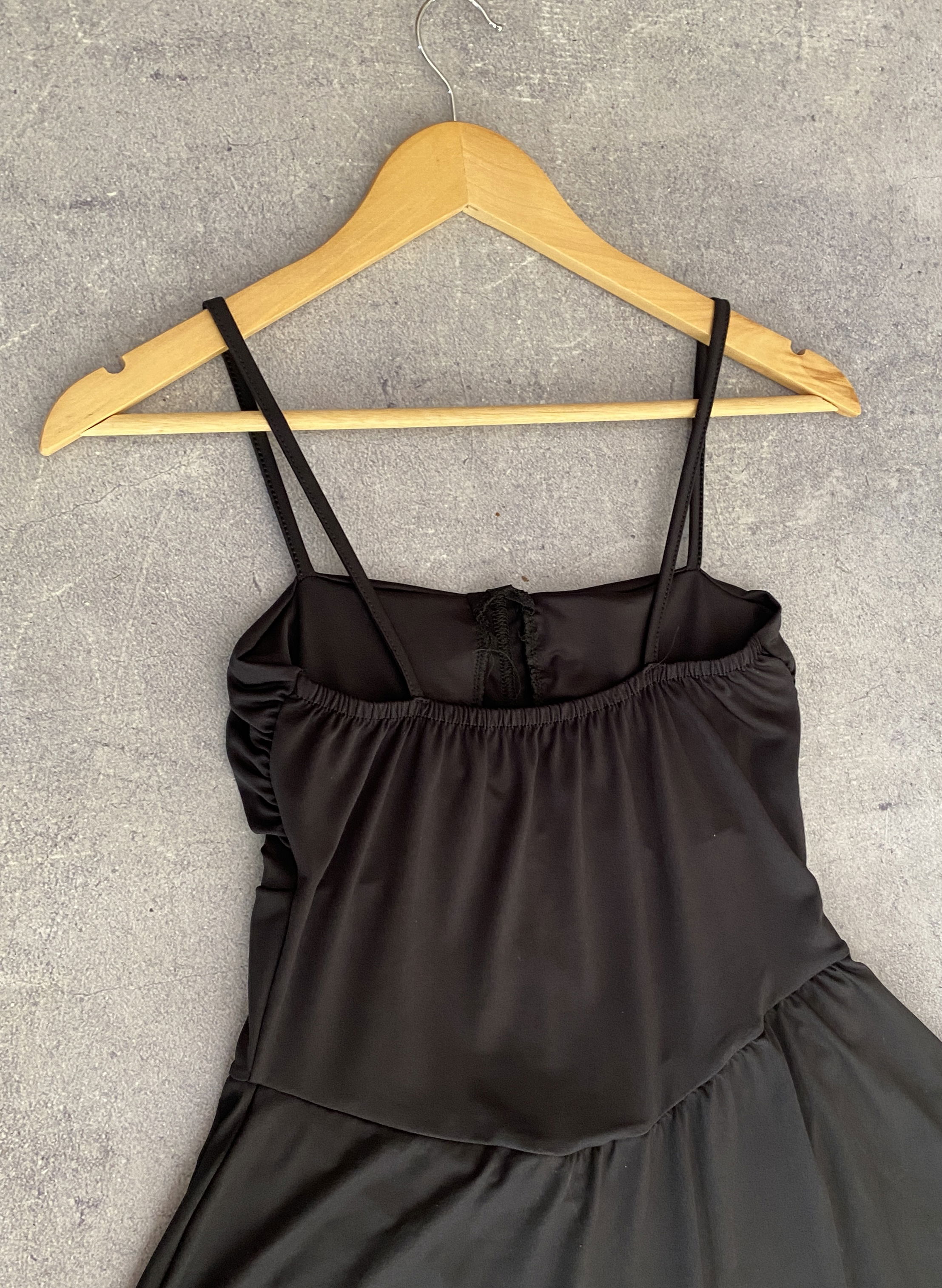 Vestido estilo corset en la parte de arriba y más sueltito abajo, viene con short abajo incluido. Elastizado, con elastico en la espalda.