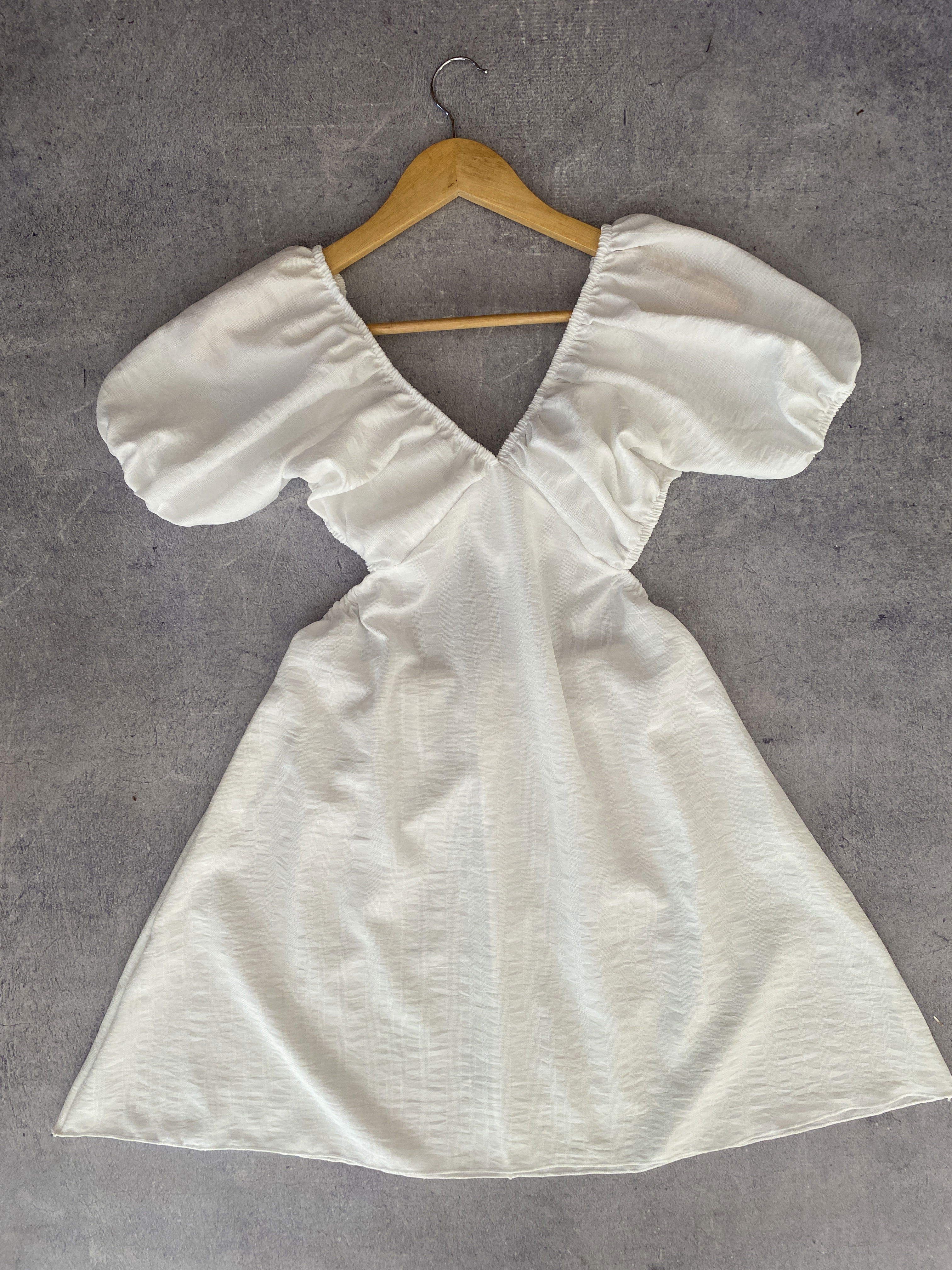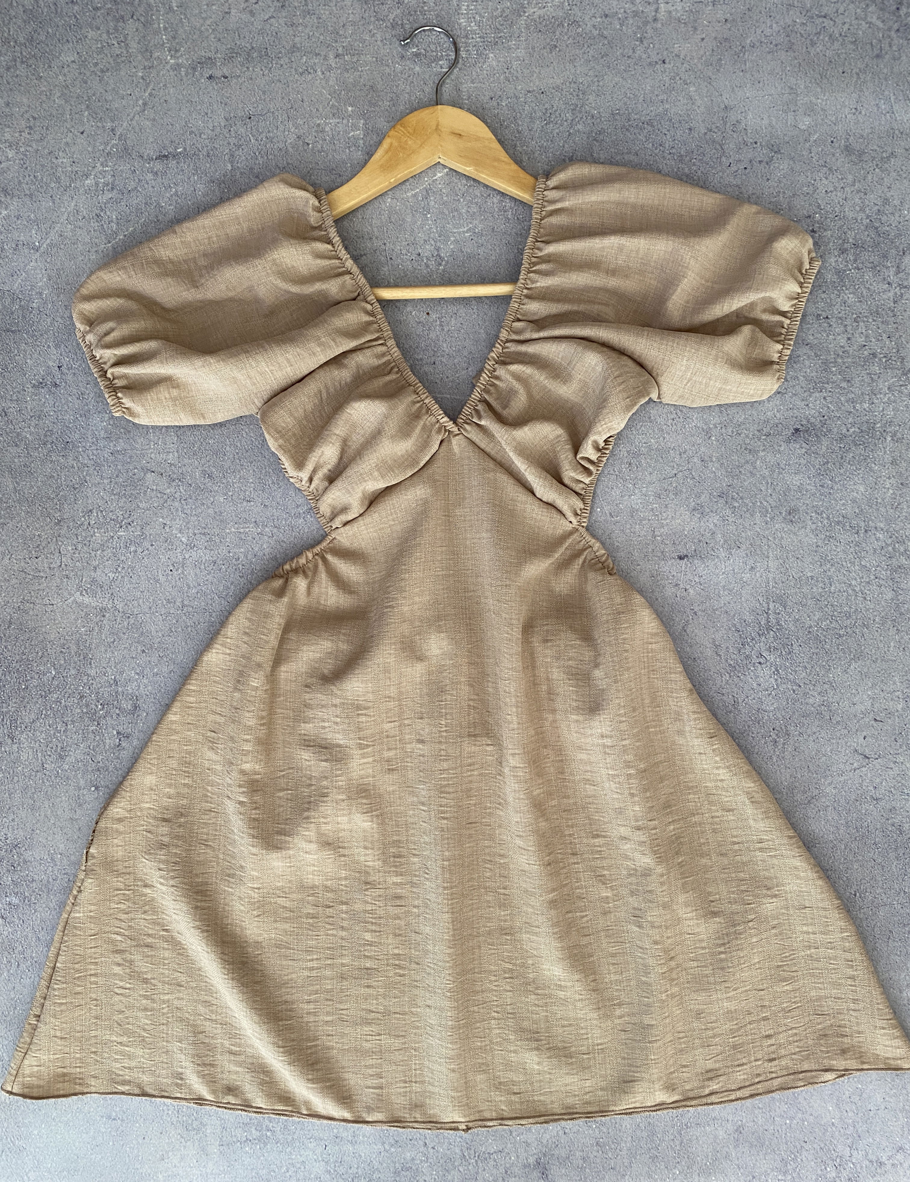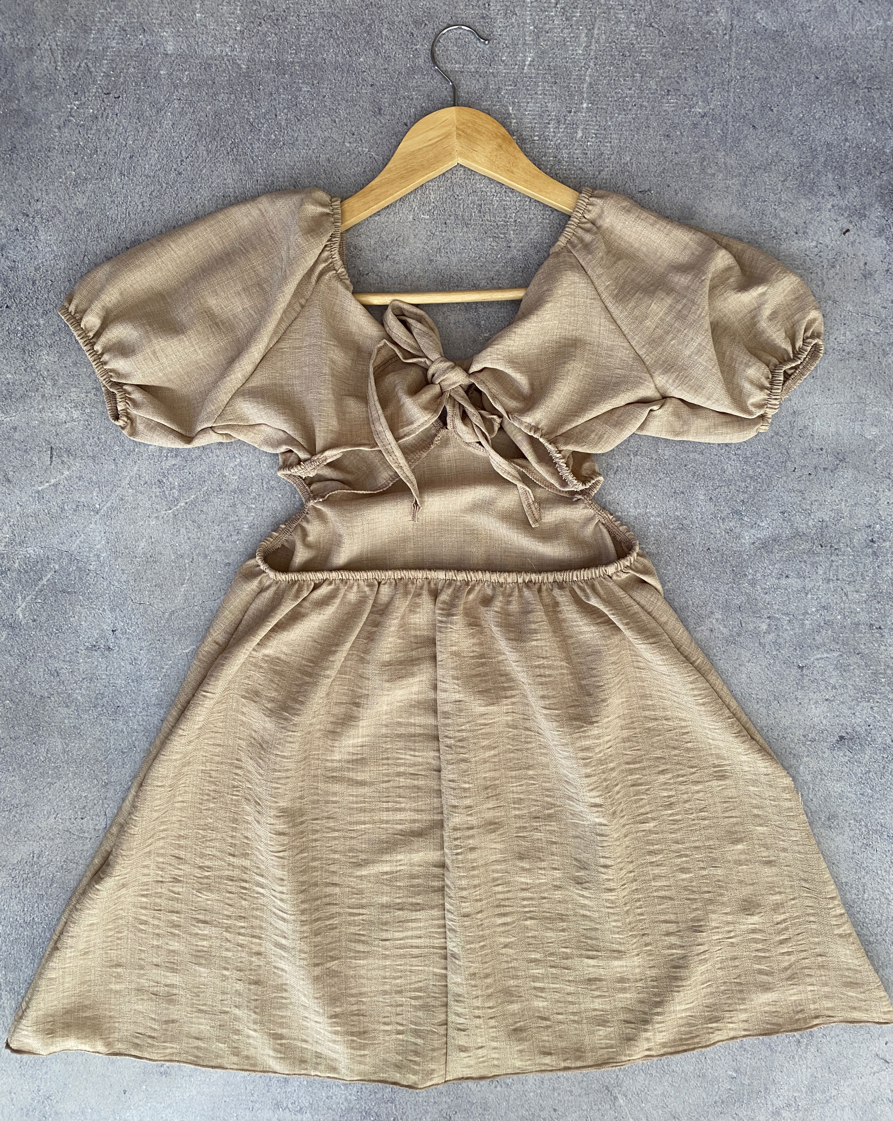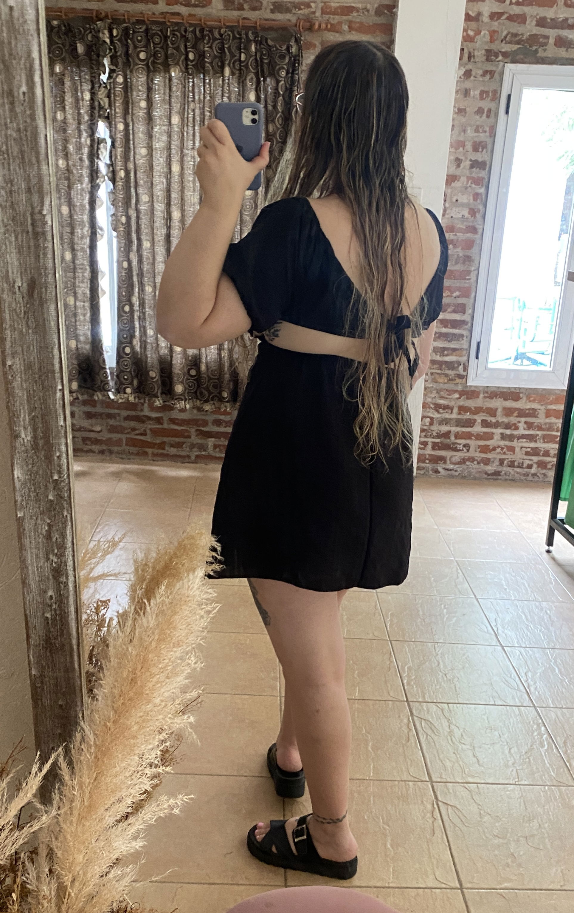 Vestido de Lino con diferenciado hermosa tela. Escote, mangas y espalda con elastico lo cual hace que se adapte súper bien al cuerpo. Queda bellísimo y súper fresco. También se ata en la espalda lo cual lo regulas vos a tu medida.