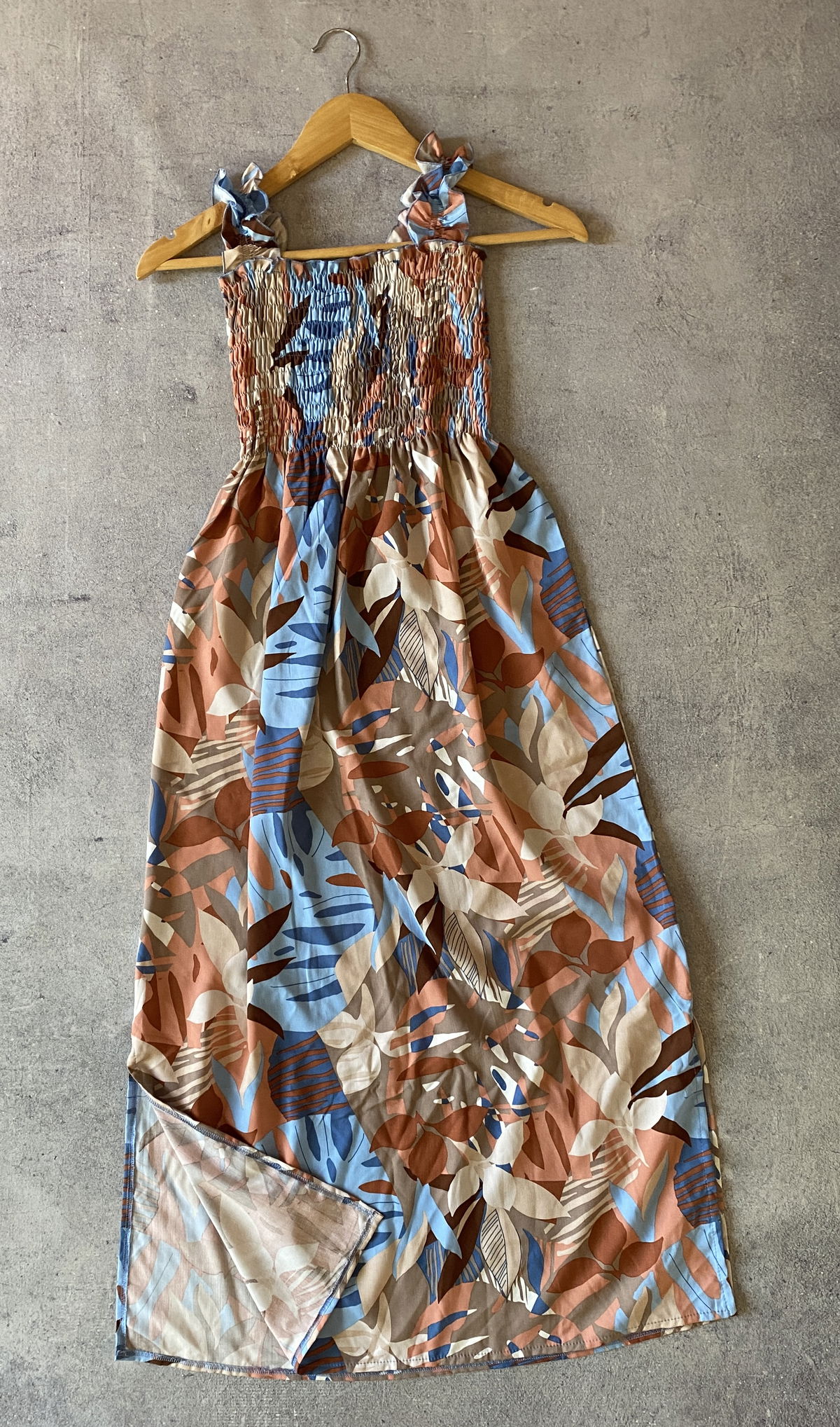 Vestidos largos de fibrana poplin, con tajos en los costados. Y frunce en la parte del pecho, lo cual lo hace súper adaptable y cómodo. Una prenda fresca e ideal para miles de momentos.