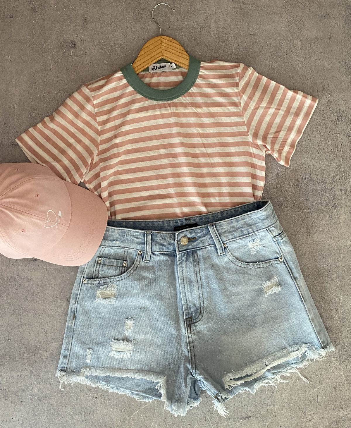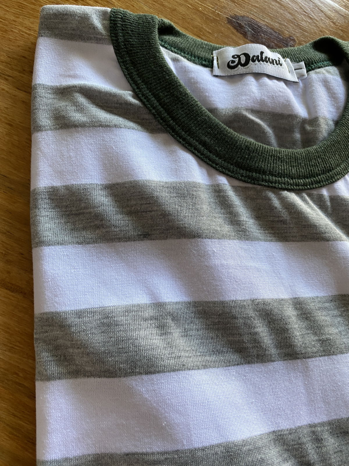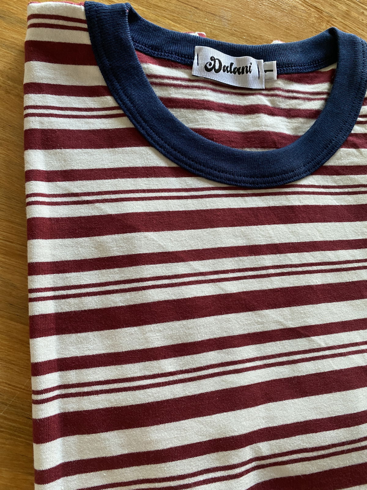 Remera rayada de algodón peinado con cuello Ribb de excelente calidad.