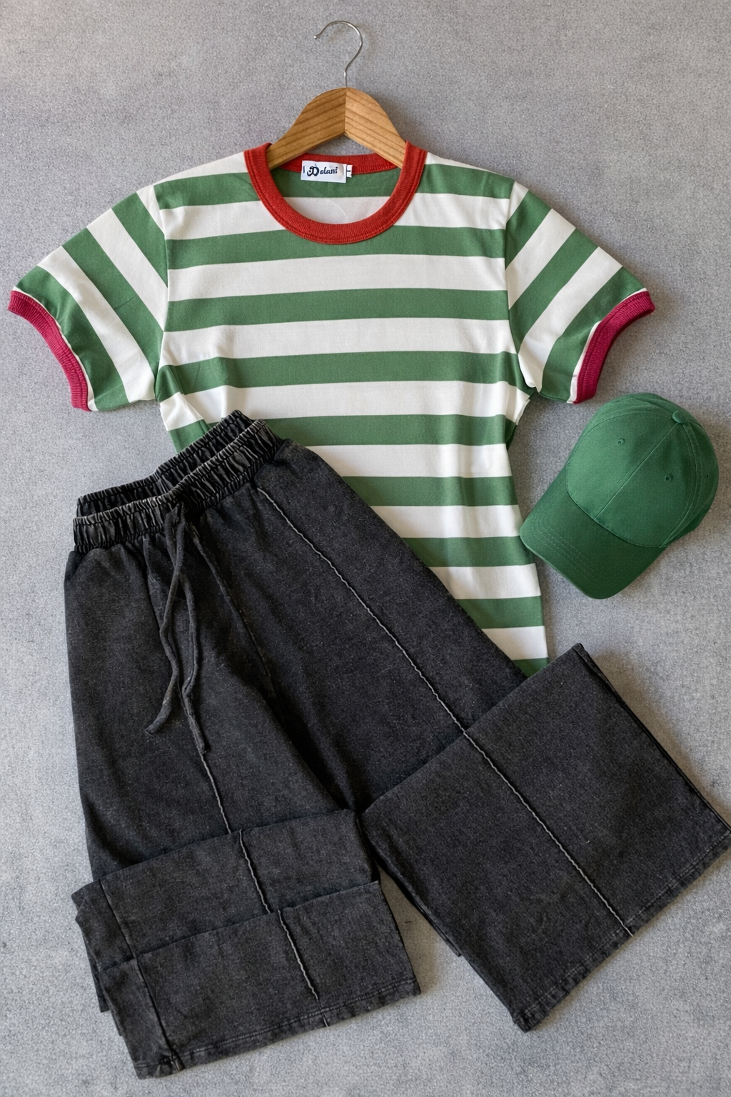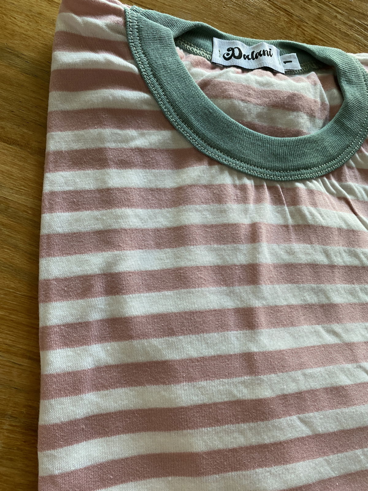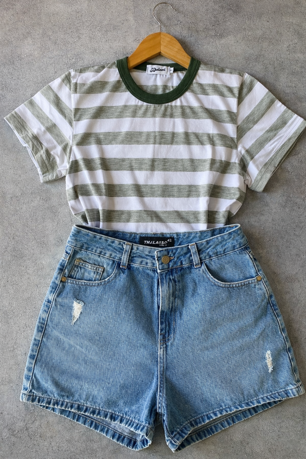 Remera rayada de algodón peinado con cuello Ribb de excelente calidad.